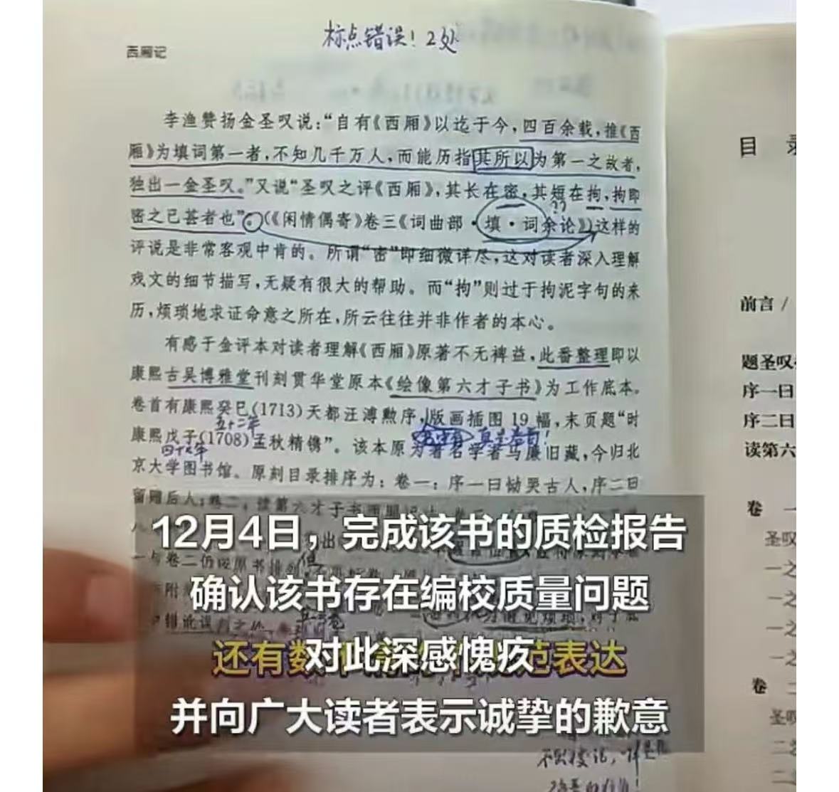 “我只粗略看了《西厢记》一遍,就发现了300多个各种各样千奇百怪的错误。”教育博主“北大一五老师”日前在社交媒体为古籍出版“两巨头”所出版的书籍挑错。其中上海某古籍出版社“国学典藏”系列的《西厢记》存在内容错误、文字缺漏、标点错误等多处严重问题;而北京某知名古籍出版社“语文课推荐阅读丛书”之《世说新语》,“短短两本100多页的小册子,至少有30多处错误!”对此,两间出版社接连发布通报致歉,承认书籍存在“编校质量问题”,已全面下架。